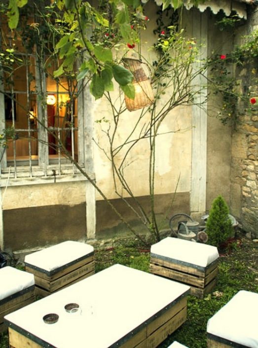 ∗ D’un salon « Lounge » composé de mobiliers tables basses (3) et assises (12) associant matières vinylique, métallique (zinc) et végétal (bois de caisse de pommes).